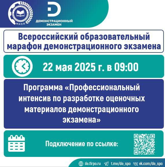 Уважаемые коллеги! Напоминаем, что завтра, 22 мая, пройдет очередное мероприятие Всероссийского образовательного марафона демонстрационного экзамена - семинар «Профессиональный интенсив по разработке оценочных материалов».