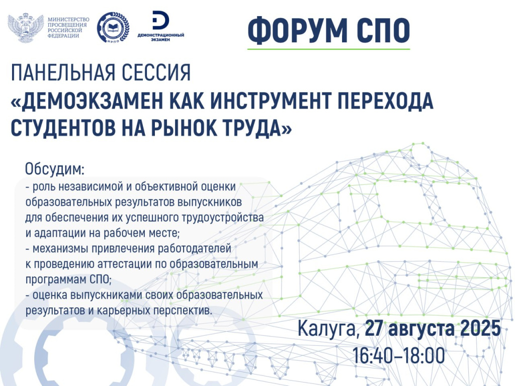 27 августа в Калуге в рамках «Форума СПО» состоится панельная сессия «Демоэкзамен как инструмент бесшовного перехода студентов на рынок труда».