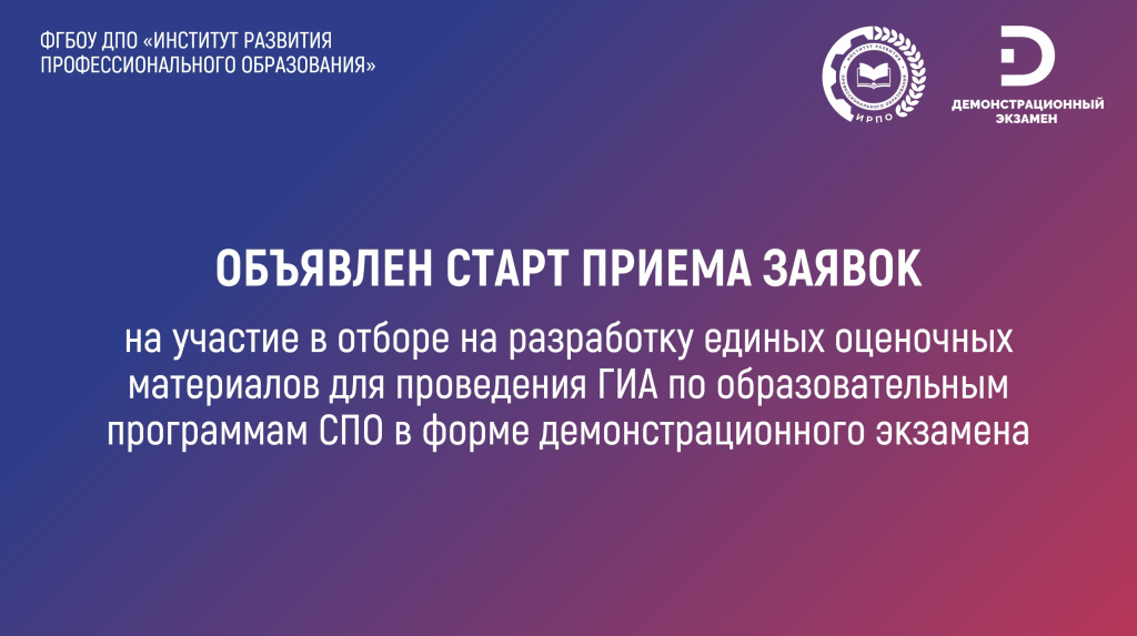 Институт развития профессионального образования начал прием заявок на участие в отборе претендентов на разработку единых оценочных материалов для обеспечения проведения государственной итоговой аттестации (ГИА) по программам среднего профессионального образования в форме демонстрационного экзамена в 2026 году.