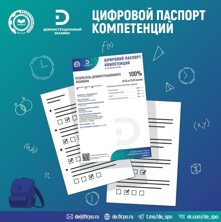 Цифровой паспорт компетенций – это электронный документ, который подтверждает ваш уровень профессиональных навыков. Он формируется автоматически после успешной сдачи демонстрационного экзамена.