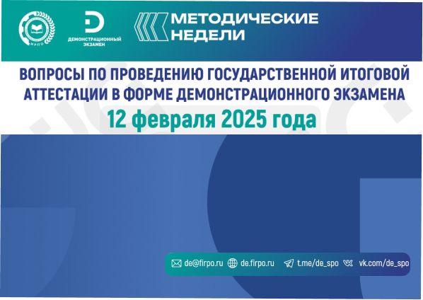 12 февраля в рамках проведения «Методические недели СПО - 2025» пройдут секции по вопросам проведения государственной итоговой аттестации в форме демонстрационного экзамена: