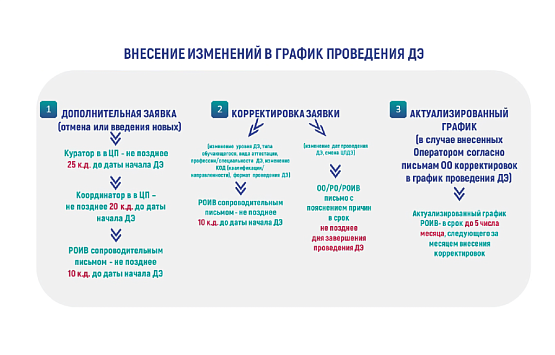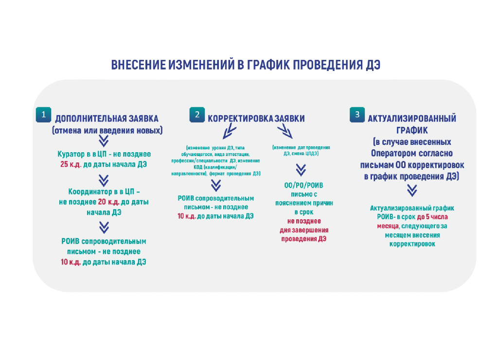РОИВ в срок не позднее 10 (десяти) календарных дней до даты начала ДЭ направляет Оператору дополнительный график проведения ДЭ (по форме приложения № 2 к Порядку) с сопроводительным письмом с указанием в нем ID экзамена и информации о причинах изменения графика.