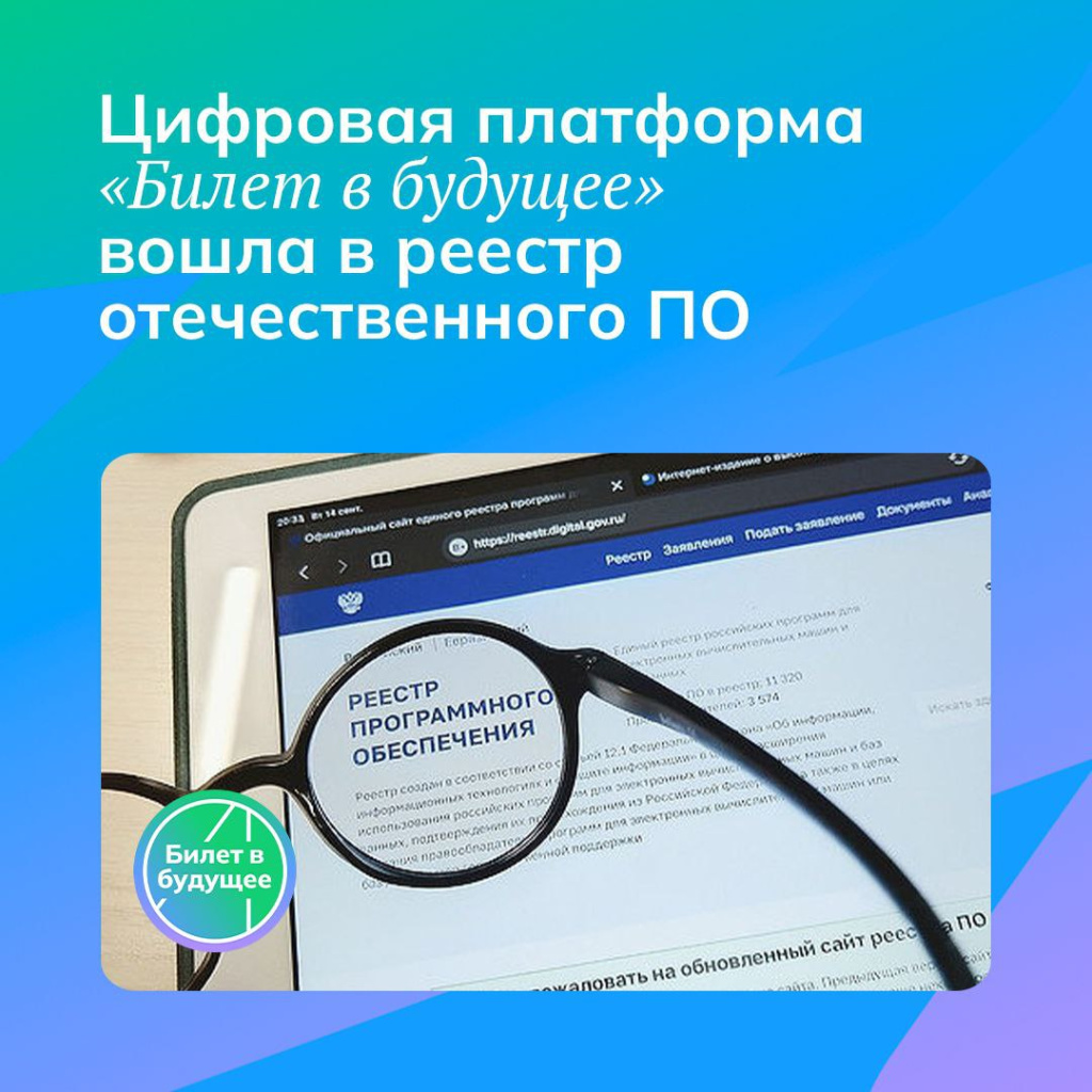 Программное обеспечение единого цифрового портала «Билет в будущее» официально включено в Реестр российского программного обеспечения Минцифры России. Это подтверждает, что платформа является безопасной, надежной и технологически независимой.