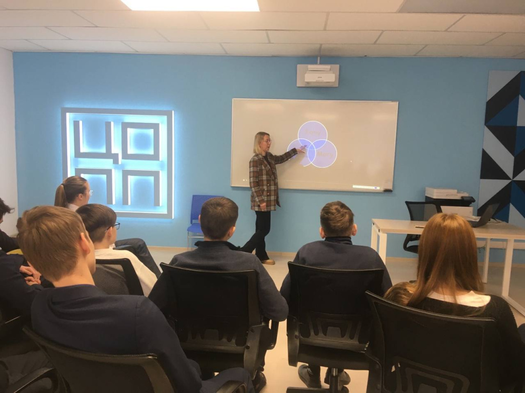 Ребята прошли тестирование для определения типа профессии, к которому относятся школьники. Также Надежда Колесова рассказала восьмиклассникам о формулах выбора профессии «Хочу. Могу. Надо», «Икигай» и научила пользоваться инструментами для самостоятельного и ответственного выбора профессии.