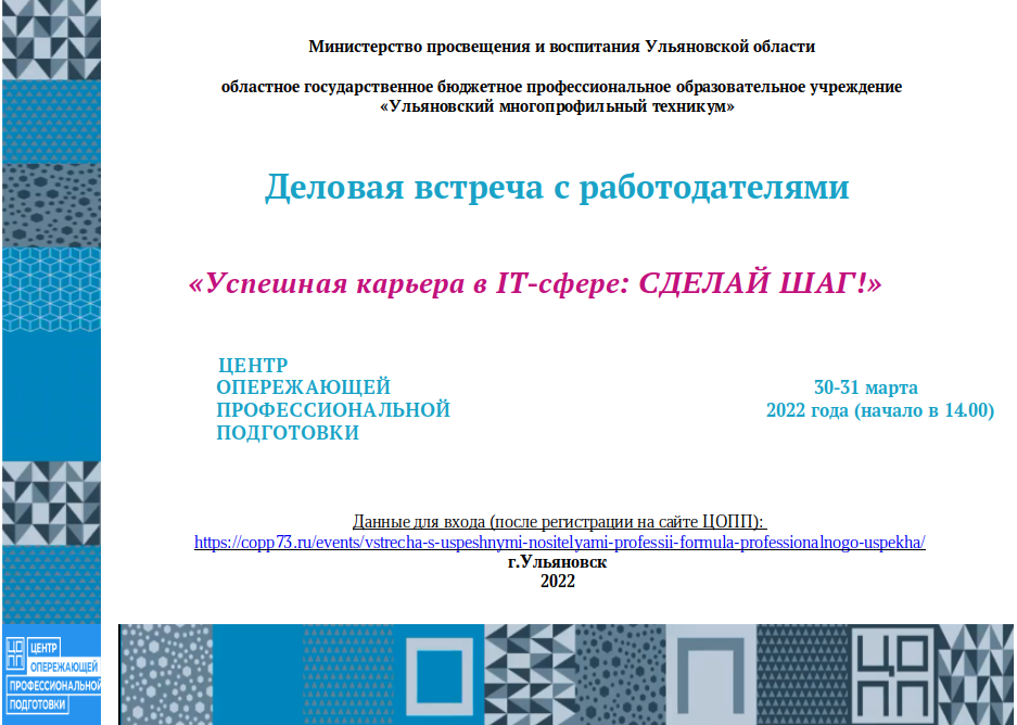 Участие в мероприятии позволит Вам расширить знания об IT-сфере, поделиться собственным мнением и узнать, в каких образовательных организациях региона можно учиться по IT- специальностям.