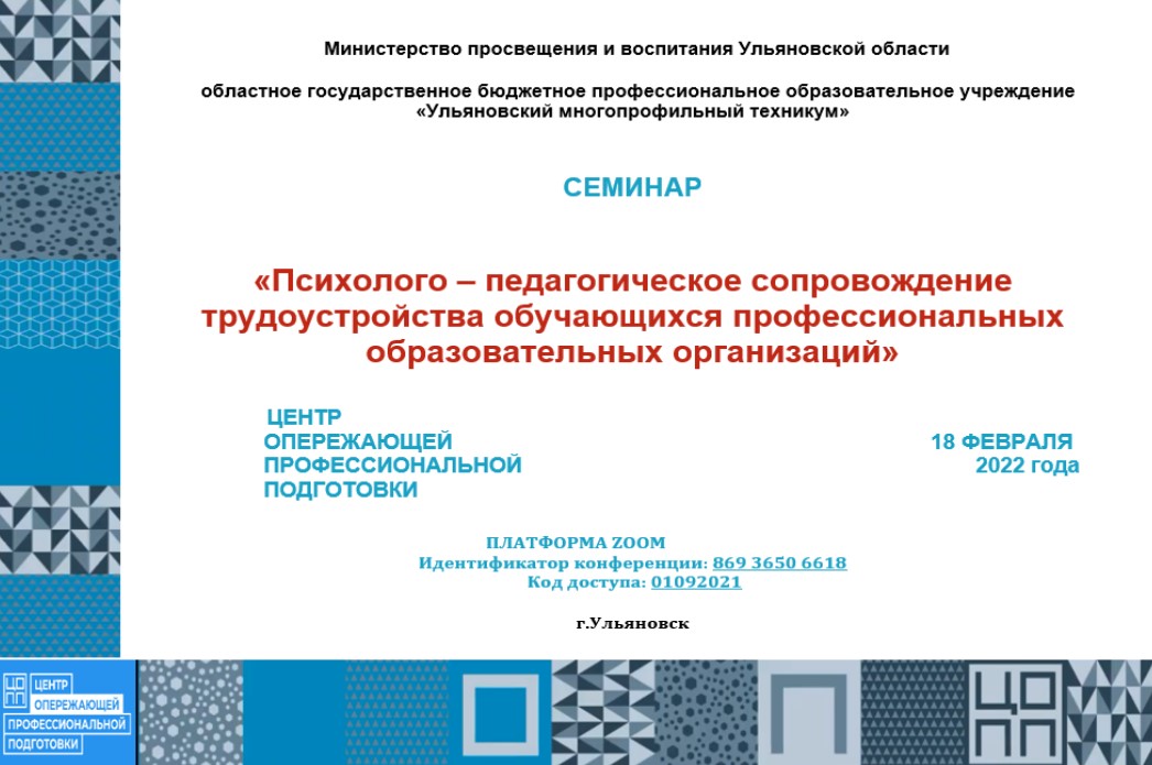 18 февраля с 10.00 до 13.00 Центр опережающей профессиональной подготовки организует семинар «Психолого – педагогическое сопровождение трудоустройства обучающихся профессиональных образовательных организаций»