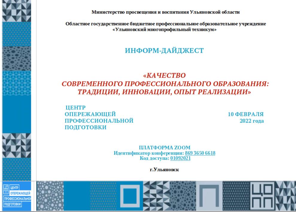 10 февраля в Центре опережающей профессиональной подготовки состоится информ-дайджест по теме: «Качество современного профессионального образования: традиции, инновации, опыт реализации».
