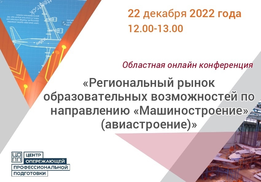 22 декабря с 12:00 до 13:00 приглашаем школьников 9-х классов принять участие в областной онлайн - конференции «Региональный рынок образовательных возможностей по направлению «Машиностроение» (авиастроение)».